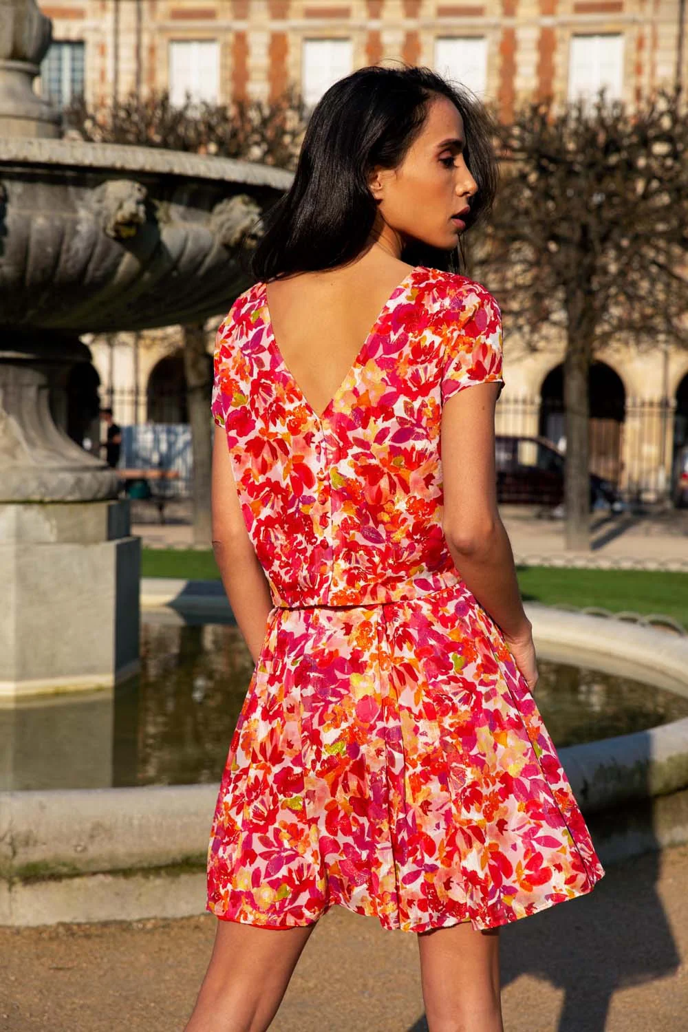 - Jupe courte évasée en mousseline de lurex imprimé fleurs exotiques- Pli creux milieu devant et plis plats de chaque côté- Au dos, pli plat de part et d’autre de la fermeture invisible- Taille haute avec ceinture- Poches insérées dans les coutures côtés- Finitions ourlet invisible (retour d’ourlet de 3 cm)- Jupe entièrement doublée- Longueur côté sous la ceinture 42 cm (pour un 38)Matière principale : 88,5% Polyester, 11,5% Polyester métallisé. Doublure : 100% Viscose. Nettoyage à sec. Pas de repassage. Fabriquée en Europe.